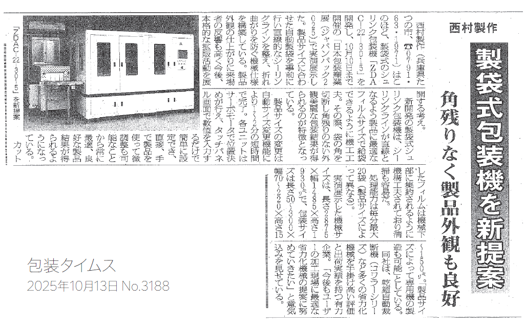 この度、包装タイムスにJAPAN PACK2025で初出展した「製袋式シュリンク包装機 ZDAC-22-3015」を掲載していただきました。